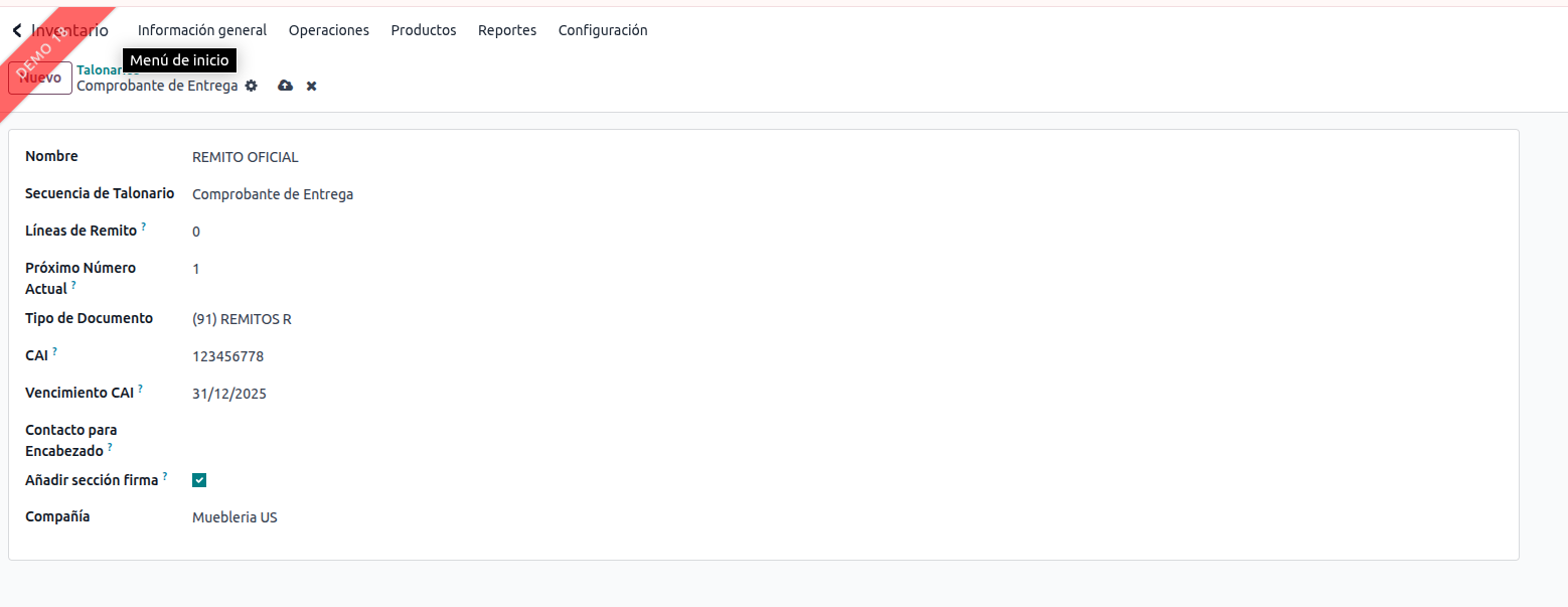 - Ingresar al módulo de Inventario → Configuración → Talonarios.
